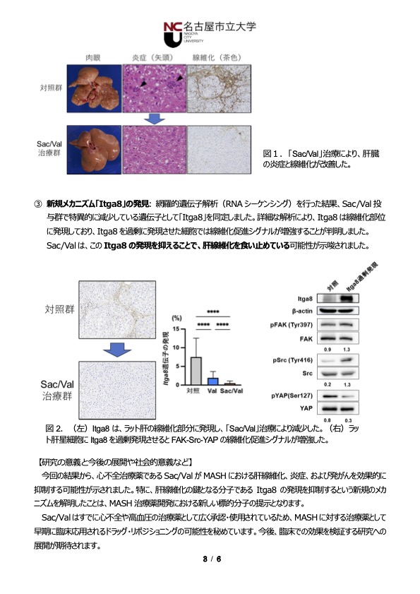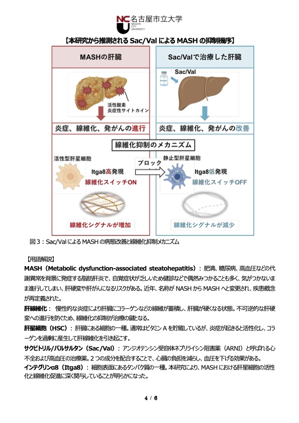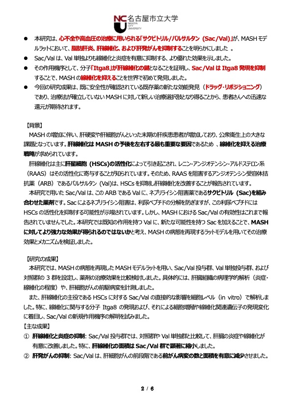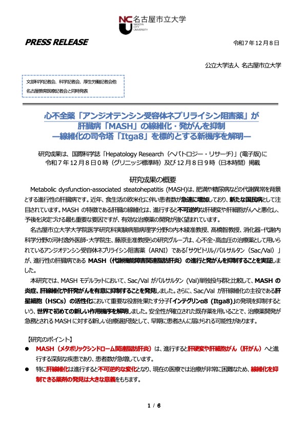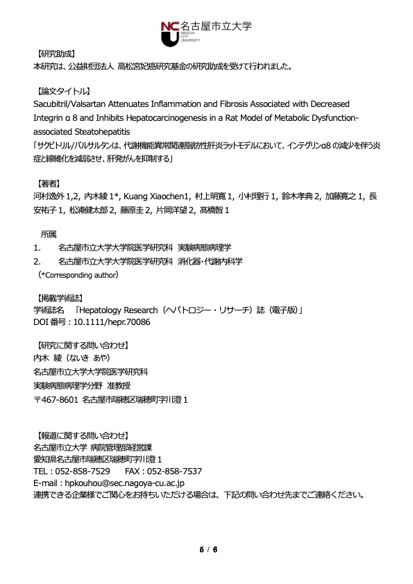 実験病態病理学分野の内木綾准教授、髙橋智教授、消化器・代謝内科学分野の河村逸外医師・大学院生、藤原圭准教授らの研究グループは、心不全・高血圧の治療薬として用いられているアンジオテンシン受容体ネプリライシン阻害薬(ARNI)である「サクビトリル/バルサルタン(Sac/Val)」が、進行性の肝臓病であるMASH(代謝機能障害関連脂肪肝炎)の進行と発がんを抑制することを実証し、その成果は国際科学雑誌「Hepatology Research(ヘパトロジー・リサーチ)」電子版に掲載されました(英国時間12月8日午前0時に掲載)。